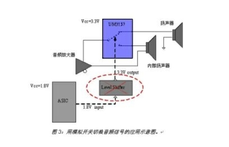 此外,英聯(lián)電子的低ICCT系列模擬開關(guān)具有更低的VIH電平值,可以采用較低的控制電平實(shí)現(xiàn)開關(guān)的高電平切換控制。這種特性大大減少了電路復(fù)雜性,特別是在供電電源和控制信號(hào)電平不匹配的便攜產(chǎn)品應(yīng)用中,可省去電平轉(zhuǎn)換模塊,從而有效降低了成本。以圖3所示的模擬開關(guān)切換音頻信號(hào)為例,如果采用ASIC輸出的1.8V電平作為UM3157控制管腳的輸入,則不必采用電平轉(zhuǎn)移器,就能在漏電流很小的情況下實(shí)現(xiàn)開關(guān)切換。此外,由于低ICCT模擬開關(guān)的電流功耗很低(大約1uA),且開關(guān)的導(dǎo)通電阻隨工作電壓的增加而降低,所以可以采用較高的供電電壓來實(shí)現(xiàn)更低的導(dǎo)通電阻。低導(dǎo)通電阻對(duì)典型的音頻開關(guān)或USB應(yīng)用而言非常重要。