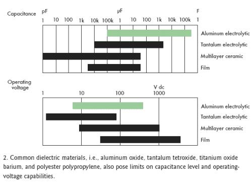 [page]標(biāo)準(zhǔn)電容的結(jié)構(gòu)是在兩個附屬于金屬板上的電極之間夾一層電介質(zhì)層(圖1)。根據(jù)電容類型不同,電介質(zhì)可以是氧化鋁、四氧化鉭、氧化鈦鋇或聚丙烯聚酯,不同的材料決定了不同的容量和電壓特性(圖2)。電介質(zhì)的多少和極板間的距離也會影響電容量。然而,極板間最大允許距離限制了電介質(zhì)的數(shù)量。
