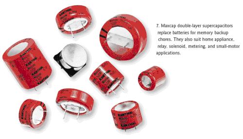 KanthalGlobar公司的Maxcap雙層電容器可以用來代替作為存儲器后備電源的電池,具有超過5.5F/in.3的容積效率、無限的服務(wù)壽命、快速充放電能力和非常低的漏電流等特性(圖7)。KanthalGlobar公司還表示,這些電容比電池更安全,在短路時不會爆炸,也不會損壞。這些電容器是非極化器件,不需要限流電阻或過壓保護,因而可以消除裝配錯誤和相關(guān)的成本。