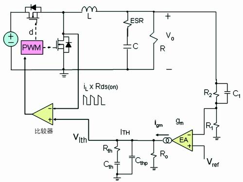 通過(guò)前面的討論可知,在每個(gè)開(kāi)關(guān)周期,低端的開(kāi)關(guān)管流過(guò)的電流波形為下降階段的梯形波。這種電流模式常稱(chēng)為谷點(diǎn)電流模式。和峰值電流模式一樣,谷點(diǎn)電流模式反饋也有兩個(gè)環(huán)路:一個(gè)電壓外環(huán),另一個(gè)是電流內(nèi)環(huán)(見(jiàn)圖2)。