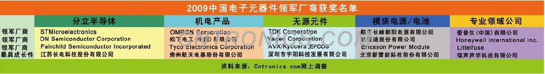 2009中國市場電子元器件領(lǐng)軍廠商評選活動隆重亮相,在社區(qū)網(wǎng)友的積極參與下,經(jīng)過激烈的網(wǎng)上投票和打分,令人翹首期盼的獲獎名單終于震撼登場,共有16家中外企業(yè)最終獲得“2009中國市場電子元器件領(lǐng)軍廠商”稱號,另有五家本土企業(yè)分獲“2009中國市場電子元器件最具成長性公司”稱號。