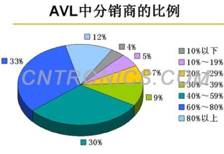 在合格供應商清單(AVL,Approved Vendor List)中,有超過1/3的電子整機廠商的AVL中分銷商比例超過六成,1/3的整機廠商的AVL中分銷商占據(jù)半壁江山??傮w有超過2/3的整機廠商中有一半的產(chǎn)品供應來自分銷商。可見分銷商在電子元器件供應鏈中扮演重要角色。