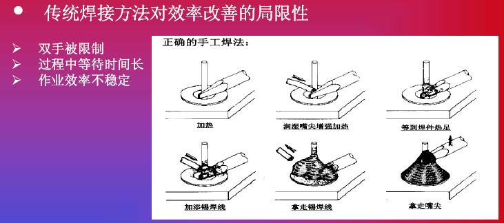 在發(fā)熱功率方面的提高,我們碰到另外一個(gè)問題。我們也可以看到951和937,還有新推出來機(jī)器,我們將發(fā)熱功率進(jìn)行對(duì)比。他們也花了很多研發(fā)精力來提高發(fā)熱功率,如果在提高發(fā)熱功率之后,確實(shí)能提高生產(chǎn)效率,但是它是不是可以被無限制提升呢?現(xiàn)在的機(jī)器比如到150瓦到160瓦,已經(jīng)上升了3倍,是否還會(huì)提高到4倍,這一個(gè)效率的提高導(dǎo)致整體效率的提高,我個(gè)人不是很贊同。其實(shí)這是比較系統(tǒng)性的解決方案,我們看到MUELLER是通過對(duì)工藝改進(jìn)達(dá)到更高的焊接效率。在談到這款機(jī)器之前,我們回顧一下傳統(tǒng)焊接方法作業(yè)的特點(diǎn),我們的圖從左到右看,整個(gè)工藝從加熱到預(yù)熱,再繼續(xù)加熱,第四步是添加焊心,然后取走焊嘴,這是非常傳統(tǒng)的焊接工藝,反過來看,我們看到整個(gè)焊接過程中,雙手是被限制的。從第二張圖開始,都是靠手去拿,關(guān)鍵是控制在雙手被占用。過程等待時(shí)間會(huì)很長(zhǎng),我們可以看到實(shí)際作業(yè)過程中下面三步是真正起到作用,前面預(yù)熱當(dāng)然是準(zhǔn)備工作,但是在這個(gè)工作中,我們雙手等待的時(shí)間會(huì)非常長(zhǎng)。第三個(gè),作業(yè)效率不是特別穩(wěn)定,因?yàn)槲覀兯湾a的時(shí)候,以及拿走錫絲過程中依賴員工本身的技巧和技術(shù)。