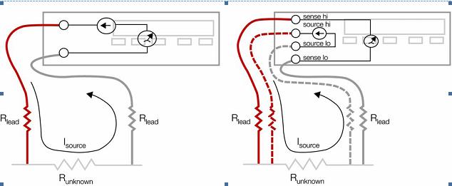 源端引線中的串聯(lián)電阻不影響電流流動(dòng)。測(cè)量/傳感引線幾乎沒(méi)有電流流動(dòng),因?yàn)閮x表的輸入阻抗很高。這意味著測(cè)量引線中沒(méi)有I x R電壓下跌。因此,您只需測(cè)量由于流經(jīng)的源電流而在未知電阻器中產(chǎn)生的電壓下跌。