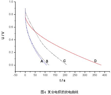 圖4給出了各電極在恒定電流為2mA的情況下的放電曲線,可以看出各電極均具有良好的線性放電性質(zhì)。由公式(1)計算得出A、B、C和D四種電極材料的比電容分別為51.3F/g、56.2F/g、93.2F/g和126F/g。由上節(jié)分析可知,雙電層和法拉第贗電容的共同作用,提高了活性炭/二氧化錳復合電極的容量,同時也表現(xiàn)出了良好的放電特性。在對電容容量的貢獻上,二氧化錳的作用要優(yōu)于碳納米管。