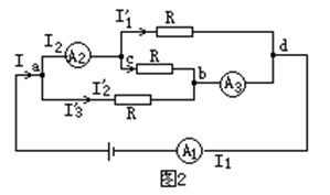 不計電流表內(nèi)電阻時,三個電阻并聯(lián).設總電流為I,則通過每個電阻的電流