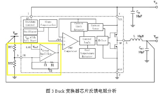 Buck變換器由于具有效率高的優(yōu)點而被廣泛應用于手機、GPS、MP3等移動多媒體設備上,目前很多電源管理芯片制造廠商都推出了不同電流能力的Buck變換器,這類變 換器雖然在電流能力和保護功能方面存在一些差異,但是他們電路的主框架結構是基本一致的,主要可以分為兩個部分:一是實現(xiàn)電能轉換的主功率部分,另一部分 是實現(xiàn)負反饋控制的控制電路。下圖是BCD半導體公司的Buck變換器AP3406的典型應用圖,黃色框里是對反饋電阻的作用做簡要分析。