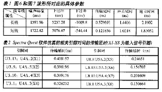 檢測(cè)器的每個(gè)信號(hào)應(yīng)盡可能保持同一傳輸延遲,這就要求布線時(shí)盡量保持長(zhǎng)度一致,對(duì)于微弱的差別,可以根據(jù)仿真結(jié)果延長(zhǎng)或縮短布線。完成布線以后,再利用Spectra Quest軟件仿真輸入信號(hào)的傳輸延遲,具體參數(shù)如表2所示??梢钥闯?,其相對(duì)延時(shí)不超過(guò)0.2ns,仿真結(jié)果比較理想。