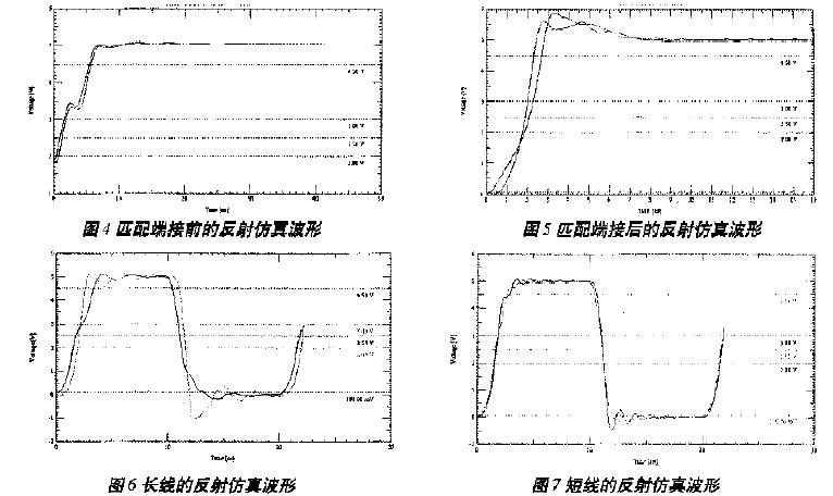 用頻率為50MHz,占空比為0.5的Pulse信號(hào)作觸發(fā),圖4和圖5分別為利用Signoise工具仿真得到的匹配端接前、后的仿真波形。從圖中可以看出,端接前,波形在上升沿有畸變發(fā)生,容易引起誤操作。匹配端接有效地消除了信號(hào)的畸變,單調(diào)性很好,而且在上升沿拉升了原信號(hào),提前進(jìn)入電平切換,增加了信號(hào)的穩(wěn)態(tài)時(shí)間,信號(hào)的上升沿也比較平穩(wěn)。雖然在高電平的維持階段有上過(guò)沖,但對(duì)信號(hào)確認(rèn)沒(méi)有影響,信號(hào)質(zhì)量比較理想。另外,信號(hào)傳輸線長(zhǎng)度對(duì)反射也有一定的影響。仿真發(fā)現(xiàn),傳輸線較長(zhǎng)時(shí),出現(xiàn)了預(yù)示的反射現(xiàn)象,如圖6所示;而傳輸線較短時(shí),仿真波形和分析結(jié)果吻合得很好,如圖7所示。表1為上述兩種情況下的波形仿真參數(shù)。所以,布線長(zhǎng)度不同,其處理方法也應(yīng)不同。一般來(lái)說(shuō),走線長(zhǎng)度小于2英寸,以集總參數(shù)的LC電路來(lái)處理;大于8英寸,則以分布參數(shù)的傳輸線電路來(lái)對(duì)待。
