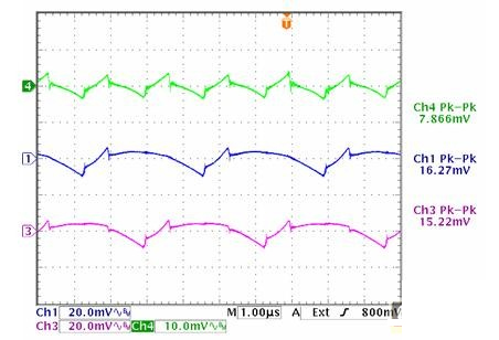 圖2a顯示了一款120°交錯式(條件:10V輸入、2V輸出、3A負(fù)載及300kHzPWM開關(guān))PWM結(jié)構(gòu)的三相交錯式降壓轉(zhuǎn)換器的示波器屏幕采集圖。示波器通道1至3顯示的是單個相位電壓,而通道4顯示的是交錯式輸出電壓(所有示波器通道均為AC耦合)。通過所有運(yùn)行中的三個相位,可以得出該輸出紋波為4.9mV(輸出電壓的0.25%)。在沒有調(diào)整兩個剩余相位(見圖2b)角的情況下,切除相位2會引起輸出紋波增加86%,即為9.1mV。為了獲得180°交錯(見圖2c),對兩個剩余相位進(jìn)行軟件調(diào)整以后,該紋波減少至7.9mV。在仍然比初始值大的同時(因?yàn)橐粋€兩相位系統(tǒng)無法獲得如一個三相系統(tǒng)一樣的低紋波),其比未被調(diào)整的剩余相位角提高了13%。