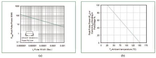 對瞬變電壓的吸收功率(峰值)與瞬變電壓脈沖寬度間的關(guān)系。手冊給的只是特定脈寬下的吸收功率(峰值),而實際線路中的脈沖寬度則變化莫測,事前要有估計。對寬脈沖應(yīng)降額使用。