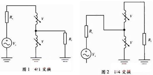 變壓器:主要實(shí)現(xiàn)低頻段,隨著工作頻段的升高,這類電路的應(yīng)用越來越少。傳輸線變壓器可以實(shí)現(xiàn)寬帶阻抗變換,實(shí)現(xiàn)4:1和1:4工作模式如圖1和圖2所示??梢詫?shí)現(xiàn)平衡和非平衡的變換,尤其在電視機(jī)外接天線到同軸線輸入端口的連接中得到應(yīng)用。