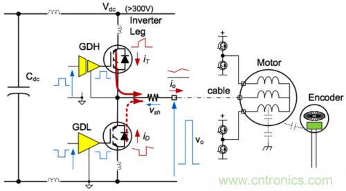 三相逆變器是一種功率電子開(kāi)關(guān)電路,控制功率從直流供電軌到三個(gè)交流電機(jī)繞組的流動(dòng)。逆變器有三條相同的腿,每條腿包括兩個(gè)IGBT晶體管和兩個(gè)二極管,如圖1所示。每個(gè)電機(jī)繞組均連接至通過(guò)分流器連接高端晶體管和低端晶體管的同一節(jié)點(diǎn)。逆變器使電機(jī)繞組在直流總線的高壓軌和低壓軌之間切換,以控制平均電壓。繞組具有極高的電感性,將阻擋電流的變化,因此,當(dāng)功率晶體管關(guān)閉時(shí),電流將開(kāi)始在連接至相反電源軌的二極管中流動(dòng)。這樣,即使逆變器功率設(shè)備和直流鏈路電容中存在斷續(xù)傳導(dǎo),也會(huì)有電流連續(xù)流到電機(jī)繞組中。電機(jī)繞組阻抗充當(dāng)來(lái)自逆變器的高壓脈沖寬度調(diào)制方波輸出電壓的低通濾波器。將低壓控制電流連接至逆變器時(shí)存在巨大的困難。一個(gè)基本問(wèn)題是,高端晶體管發(fā)射器節(jié)點(diǎn)在高壓總線高供電軌與低供電軌之間切換。首先,高端驅(qū)動(dòng)器必須能夠驅(qū)動(dòng)相對(duì)于一個(gè)發(fā)射器(可能比共用輸入信號(hào)高300 V或以上)的柵極信號(hào)。其次,通過(guò)分流器(vsh)的電機(jī)電流信號(hào)必須從300 V或以上的共模電壓中提取出來(lái)。其他問(wèn)題將由電源電路中的寄生元件導(dǎo)致。當(dāng)功率晶體管或二極管的開(kāi)關(guān)頻率超過(guò)1 A/ns時(shí),即使是10 nH的PCB走線電感也可能導(dǎo)致顯著的電壓(>10 V)。寄生電感和部件電感會(huì)導(dǎo)致振鈴,結(jié)果使設(shè)備開(kāi)關(guān)產(chǎn)生的噪聲脈沖的持續(xù)時(shí)間變長(zhǎng)。甚至電機(jī)電纜的高頻阻抗也可能帶來(lái)問(wèn)題,因?yàn)槌鲇诎踩紤],配電板可能離電機(jī)很遠(yuǎn)。其他效應(yīng)包括噪聲從電機(jī)耦合到反饋傳感器信號(hào)中,其原因是快速切換的繞組電壓波形。問(wèn)題將變得更加嚴(yán)重,因?yàn)轵?qū)動(dòng)電路的功率額定值將增加電路板的物理尺寸,結(jié)果將進(jìn)一步增加寄生電感,甚至提高電流和電壓開(kāi)關(guān)速率。