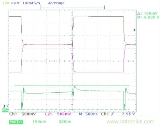 圖1中的波形顯示了一個(gè)可以在典型CAN收發(fā)器的輸出上觀察到的共模噪聲。在這幅圖像中,黑色軌跡線(通道1)顯示CANH,紫色軌跡線(通道 2)顯示的是CANL,并且綠色軌跡線(數(shù)據(jù)功能)是CANH與CANL的和。這個(gè)求和的過程給出了一個(gè)波形,它的值等于此時(shí)一個(gè)指定點(diǎn)上共模電壓的2 倍。