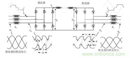 由于晶閘管只能接通,不能斷開,因此交流電壓會使晶閘管發(fā)生反向偏置并停止傳導。因此,LCC中的晶閘管的偏置取決于電網(wǎng)AC側(cè)用于換流的功率。在晶閘管正向偏置后導通時的延時決定了相位角延遲(觸發(fā)角)。晶閘管的相位角延遲實現(xiàn)了交流波的相位角控制。