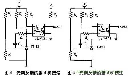 常見(jiàn)的光耦反饋第1種接法,如圖1所示。圖中,Vo為輸出電壓,Vd為芯片的供電電壓。com信號(hào)接芯片的誤差放大器輸出腳,或者把PWM芯片(如UC3525)的內(nèi)部電壓誤差放大器接成同相放大器形式,com信號(hào)則接到其對(duì)應(yīng)的同相端引腳。注意左邊的地為輸出電壓地,右邊的地為芯片供電電壓地,兩者之間用光耦隔離。圖1所示接法的工作原理如下:當(dāng)輸出電壓升高時(shí),TL431的1腳(相當(dāng)于電壓誤差放大器的反向輸入端)電壓上升,3腳(相當(dāng)于電壓誤差放大器的輸出腳)電壓下降,光耦TLP521的原邊電流If增大,光耦的另一端輸出電流Ic增大,電阻R4上的電壓降增大,com引腳電壓下降,占空比減小,輸出電壓減?。环粗?,當(dāng)輸出電壓降低時(shí),調(diào)節(jié)過(guò)程類(lèi)似。開(kāi)關(guān)電源中光耦的作用常見(jiàn)的第2種接法,如圖2所示。與第1種接法不同的是,該接法中光耦的第4腳直接接到芯片的誤差放大器輸出端,而芯片內(nèi)部的電壓誤差放大器必須接成同相端電位高于反相端電位的形式,利用運(yùn)放的一種特性——當(dāng)運(yùn)放輸出電流過(guò)大(超過(guò)運(yùn)放電流輸出能力)時(shí),運(yùn)放的輸出電壓值將下降,輸出電流越大,輸出電壓下降越多。因此,采用這種接法的電路,一定要把PWM芯片的誤差放大器的兩個(gè)輸入引腳接到固定電位上,且必須是同向端電位高于反向端電位,使誤差放大器初始輸出電壓為高。圖2所示接法的工作原理是:當(dāng)輸出電壓升高時(shí),原邊電流If增大,輸出電流Ic增大,由于Ic已經(jīng)超過(guò)了電壓誤差放大器的電流輸出能力,com腳電壓下降,占空比減小,輸出電壓減?。环粗?,當(dāng)輸出電壓下降時(shí),調(diào)節(jié)過(guò)程類(lèi)似。