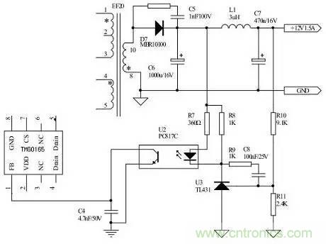 通常光耦與TL431一起使用。下面是LED電源驅(qū)動(dòng)芯片(開(kāi)關(guān)電源芯片)TMG0321/TMG0165/TMG0265/TMG03655的部分電路。兩電阻串聯(lián)取樣到431R端與內(nèi)部比較器進(jìn)行比較。然后根據(jù)比出的信號(hào)再控制431K端(陽(yáng)極接光耦那一端)對(duì)地的電阻,然后達(dá)到控制光耦內(nèi)部發(fā)光二極管的亮度。(光耦內(nèi)部一邊是一發(fā)光二極管,一邊是一光敏三極管)通過(guò)發(fā)光的強(qiáng)度??刂屏硪欢巳龢O管的CE端的電阻也就是改變了led電源驅(qū)動(dòng)芯片(開(kāi)關(guān)電源芯片)TMG0321/TMG0165/TMG0265/TMG0365檢測(cè)腳的電流(1腳:電壓反饋引腳,通過(guò)連接光耦到地來(lái)調(diào)整占控比)。根據(jù)電流的大小,led電源驅(qū)動(dòng)芯片(開(kāi)關(guān)電源芯片)TMG0321/TMG0165/TMG0265/TMG0365就會(huì)自動(dòng)調(diào)整輸出信號(hào)的占空比,達(dá)到穩(wěn)壓的目的。