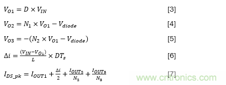 其中VO1是主輸出,VO2和VO3分別是正和負次級輸出,D是占空比,N1和N2分別是與VO2和VO3對應的變壓器的匝數(shù)比。Vdiode是二極管的正向壓降,IOUT1、IOUT2和IOUT3分別是由VO1、VO2和VO3生成的輸出電流,Ids_pk是通過頂部開關的峰值電流,△i是主電感器紋波電流的三角部分。