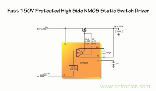 LTC7000 在 INP 引腳上接收一個參考于地的低電壓數(shù)字信號、把該信號電平移位至高達(dá) VIN 電壓。并控制片內(nèi)低阻抗上拉和下拉器件,能快速接通或判斷一個其漏極可高出地電位達(dá) 135V 的高壓側(cè) N 溝道 MOSFET。從低電壓 INP 信號至得到全面強(qiáng)化或被完全關(guān)斷的 N 溝道 MOSFET 之傳播延遲約為 35ns,這也促成了許多應(yīng)用。