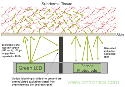 圖2中所示的短至10µs的窄光脈沖支持系統(tǒng)去容忍運(yùn)動(dòng)和陽(yáng)光,典型的方法是每秒25次采樣率下的每次次的快速光測(cè)試,一次測(cè)量是在LED關(guān)閉的情況下完成的,而另一次則是在LED打開(kāi)的情況下完成。計(jì)算得出的差值消除了環(huán)境光的影響,重要的是給出了對(duì)閃爍的背景光不敏感的期望的原始光信號(hào)測(cè)量值。