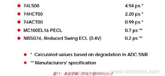 為了顯示這些抖動(dòng)值的重要性,請(qǐng)考慮與一組邏輯門(mén)相關(guān)的均方根(RMS)抖動(dòng)典型值,如 圖11所示。74LS00、74HCT00和74ACT00的值都是采用參考文獻(xiàn)1第5章所述的方法以高 性能ADC(孔徑抖動(dòng)小于0.2-ps rms)測(cè)得的,其中抖動(dòng)是從因多個(gè)相同門(mén)串聯(lián)而導(dǎo)致的FFT SNR降低計(jì)算得出的。然后,通過(guò)除以串聯(lián)門(mén)總數(shù)的平方根,便可計(jì)算出單個(gè)門(mén)所造成 的抖動(dòng)。制造商給出了MC100EL16和NBSG16的抖動(dòng)數(shù)據(jù)。