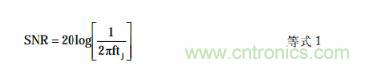 ADC寬帶孔徑抖動(dòng)tj、轉(zhuǎn)換器SNR和滿(mǎn)量程正弦波模擬輸入頻率 f之間的關(guān)系如下: