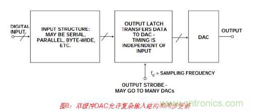 DAC輸入結(jié)構(gòu)存在無(wú)數(shù)變化形式,本文將不一一介紹,但幾乎所有都稱(chēng)為“雙緩沖”。栓 緩沖DAC具有兩組鎖存器。數(shù)據(jù)最初鎖存在第一級(jí)中,然后傳輸?shù)降诙?jí),如圖8所示。 這種配置非常有用,具體有以下幾種原因。