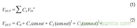 差分信號(hào)可抑制偶數(shù)階諧波。以下展示了連續(xù)波(CW)通過(guò)一個(gè) 增益模塊的示例。當(dāng)使用一個(gè)單端放大器時(shí),如圖2所示,輸出 可表示為公式1和公式2。