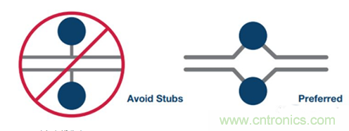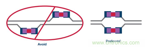 差分對(duì)布線時(shí),應(yīng)使用對(duì)稱布線(參見(jiàn)圖24)。若需要測(cè)試點(diǎn), 應(yīng)避免引入走線分支,而且測(cè)試點(diǎn)應(yīng)對(duì)稱放置(參見(jiàn)圖25)。