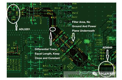 ADI公司接收器參考設(shè)計(jì)板(參見(jiàn)圖26)提供了差分濾波器PCB布局 的一個(gè)示例。這顯示了ADL5201和AD6649之間有一個(gè)五階濾波 器。AD6649是一款14位250 MHz流水線式ADC,具有非常好的SNR 性能。