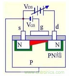 (4) VGS>0且VDS增大到一定值后,靠近漏極的溝道被夾斷,形成夾斷區(qū)。
