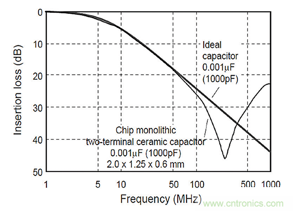圖4:理想電容和1000pF電容的插入損耗對比圖。