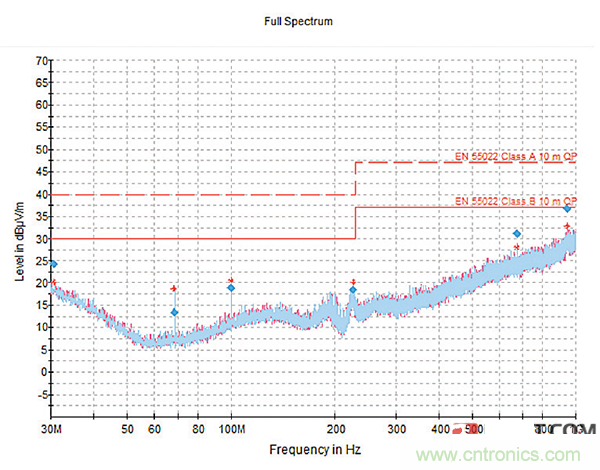 然后,使用22000pF芯片電容濾波器插件進行測試,試圖將最大濾波器性能調(diào)整到噪聲持續(xù)的較低頻率區(qū)域。如圖9所示,性能得到改善,在較低頻率的噪聲極限處或附近只有很小的尖峰。但是這個濾波器導(dǎo)致能量“膨脹”到105MHz附近的更高頻率,超過了允許的極限。
