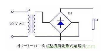 橋式整流電路每個(gè)整流二極管上流過的電流是負(fù)載電流的一半,與全波整流相同。通常情況下橋式整流電路都簡化成圖2-3-17的形式。