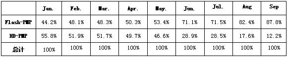 - 2008年,閃存型PMP產品銷量份額從1月份的44.2%上升到6月的87.8%