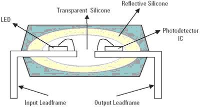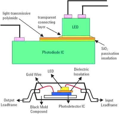 光電二極管芯片采用兩個透明的層:SiO2鈍化/絕緣和光傳導(dǎo)聚酰亞胺。LED使用透明的連接層穩(wěn)固地連接到光電二極管上。IC使用銀環(huán)氧樹脂,通過模具連接到引線框上。介電材料使用光傳導(dǎo)環(huán)氧樹脂連接到IC上。LED模具使用光傳導(dǎo)環(huán)氧樹脂連接到介電材料上。最后,組件使用焊接線和澆鑄。它使用標(biāo)準(zhǔn)模具連接工藝,完成所有放置,封裝在單次不透明澆鑄化合物中完成澆鑄。