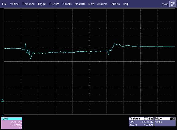 圖1展示了USB 3.0 帶有連接器線纜的的阻抗曲線。曲線表明了隨著TDR 階躍信號(hào)在線纜中的行進(jìn)阻抗變化是時(shí)間的函數(shù)。注意軌跡兩頭的阻抗變化,那是由于連接器引起的,當(dāng)使用上升時(shí)間100ps (階躍信號(hào))測(cè)試時(shí)連接器的阻抗規(guī)定是90+/- 7歐。TDR的上升時(shí)間非常重要,因?yàn)樽杩棺兓蚑DR階躍信號(hào)的上升時(shí)間成反比,而規(guī)范規(guī)定的USB 3.0信號(hào)的上升時(shí)間是100 ps,測(cè)量中匹配這個(gè)上升時(shí)間將給出信號(hào)“看到的”阻抗。