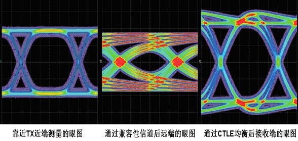 如下圖5所示,左邊的眼圖是靠近TX近端測(cè)量到的眼圖;中間的眼圖是通過(guò)兼容性信道(參考測(cè)試信道)后測(cè)量的眼圖,可見(jiàn)眼圖的張開(kāi)程度較小,抖動(dòng)較大;右邊的眼圖是仿真CTLE均衡后的眼圖,可見(jiàn)眼高和抖動(dòng)都得到改善。