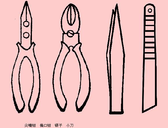 為了方便焊接操作常采用尖嘴鉗、偏口鉗、鑷子和小刀等做為輔助工具。同學(xué)們應(yīng)學(xué)會正確使用這些工具。