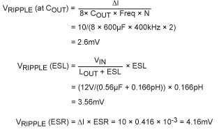 選擇輸出電容的關鍵參數(shù)是實際電容值、ESR、ESL和額定電壓。這些參數(shù)會影響系統(tǒng)的整體穩(wěn)定性、輸出電壓紋波以及瞬態(tài)響應,輸出紋波電壓包含三部分,即輸出電容儲存電荷的變化,電流流入、流出電容時在ESR和ESL上產(chǎn)生的壓降。下面給出了選擇電容使用的公式。