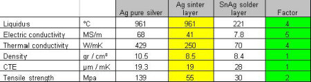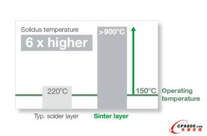 如果有人要考慮燒結(jié)層的厚度,燒結(jié)層的厚度比標(biāo)準(zhǔn)焊接層薄4.5倍,導(dǎo)熱系數(shù)大4倍。這使得燒結(jié)連接具有良好的熱性能。燒結(jié)層也表現(xiàn)出遠(yuǎn)高于焊接層的循環(huán)能力。這就得到一個事實(shí),即燒結(jié)連接中所用銀的熔點(diǎn)比今天普遍使用的無鉛焊料要高出4倍(見表1)。燒結(jié)技術(shù)高溫穩(wěn)定性表明連接層沒有老化。