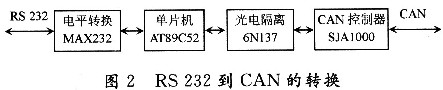 RS232串口的幀格式為:1位起始位,8位數據位,1位可編程的第9位(此位為發(fā)送和接收的地址/數據位),1位停止位。而CAN的數據幀格式為:幀信息+ID+數據(可分為標準幀和擴展幀兩種格式)。因此,設計時就需要有一個微控制器來實現電平和幀格式等的轉換,其轉換方式如圖2所示。