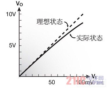 通常k>2,故R2>R1。這表明,在電阻器R2中的功耗和溫升總會(huì)超過在電阻器R1中的功耗和溫升。即使兩個(gè)電阻器均具有相同的TCR(理想情況),該放大器的增益也將變化,這是因?yàn)镽2/R1比率將取決于輸出電壓VO。因而,聲音信號(hào)的典型尖峰和脈沖可能造成放大器增益的瞬態(tài)變化。其結(jié)果是輸入電壓VI和輸出電壓VO之間的非線性依賴(圖4)。這個(gè)現(xiàn)象稱作溫度引起的放大器的非線性。其原因是電阻器的自熱,其定量的特點(diǎn)是電阻功率系數(shù)(PCR)。減小電阻功率系數(shù)(PCR)的方法是選擇具有最小絕對(duì)TCR值的R1和R2電阻器。