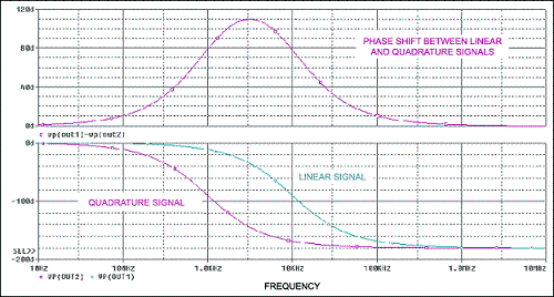 無(wú)源方案可以實(shí)現(xiàn)該電路,但是更通用的方法是有源電路(圖7)。對(duì)于線性信號(hào)(相應(yīng)的輸入通道),電路呈現(xiàn)為一個(gè)ft=10kHz的相移濾波器,對(duì)于積分信號(hào)(另一路輸入),電路呈現(xiàn)為一個(gè)ft=1kHz的相移濾波器。目的是使線性輸入信號(hào)和積分信號(hào)之間在音頻帶寬1kHz至10kHz范圍內(nèi)呈現(xiàn)90°相移。