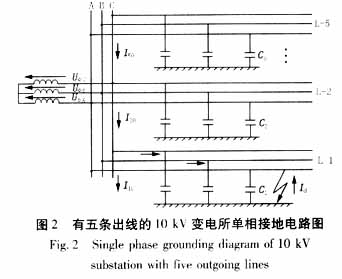 這樣,利用兩組發(fā)生在不同線路上的故障數(shù)據(jù)就可求出該系統(tǒng)中各線路的對(duì)地電容,且隨著故障次數(shù)的增多,還可利用多次的故障數(shù)據(jù)對(duì)系統(tǒng)對(duì)地電容進(jìn)行修正。系統(tǒng)對(duì)地電容值求出后,由公式I=jωCU可以很容易就估計(jì)出系統(tǒng)電容電流的有效值,以此可以決定系統(tǒng)是否需要安裝消弧線圈以及消弧線圈電感值的大小。