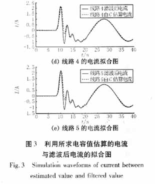 對(duì)上述方法用Matlab編程,對(duì)仿真數(shù)據(jù)進(jìn)行分析,求解系統(tǒng)對(duì)地電容值??紤]到噪聲污染以及各種隨機(jī)干擾的存在,先對(duì)故障數(shù)據(jù)進(jìn)行數(shù)字濾波,將17次以上的諧波去除后再對(duì)仿真或?qū)崪y(cè)數(shù)據(jù)進(jìn)行運(yùn)算。本例所得由電容所計(jì)算電流與濾波后電流擬合波形如圖3所示(本文對(duì)數(shù)據(jù)濾波時(shí)采用的是巴特沃思濾波器,除去9次諧波以上的高次諧波)。