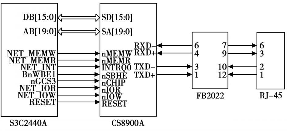 由于處理器內(nèi)并未提供物理層接口,因此需外接一片物理層芯片,以提供以太網(wǎng)的接入通道。如圖2所示,以太網(wǎng)接口電路由以太網(wǎng)物理層芯片CS8900A,網(wǎng)絡(luò)隔離變壓器FB2022和RJ45接口所組成。