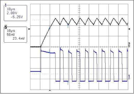 如圖7所示,Q1是降壓型充電器的開關(guān)功率晶體管;L1是濾波電感;D1是續(xù)流或整流二極管。輸入電容C1為10uF、超低ESR的陶瓷濾波電容。用鉭電容或者其它電解電容替代C1會使充電器的性能降低。R7是電流調(diào)節(jié)器檢測放大器的檢流電阻。DS2712的基準(zhǔn)電壓為0.125V,并具有24mV滯回。通過CSOUT提供閉環(huán)、開關(guān)模式電流控制。充電控制引腳CC1將Q2的柵極拉低時,使能Q1的柵極驅(qū)動。Q1和Q2均為低Vt (柵-源門限電壓)的pMOSFET。CC1和CSOUT均為低電平時,Q2的漏-源電壓將稍大于Vt。該電壓以及CSOUT的正向壓降構(gòu)成了Q1的柵極開關(guān)電壓。CC1為低電平時,啟動電流閉環(huán)控制。圖8所示為啟動開關(guān)時的波形。上方波形是0.125Ω (檢流電阻兩端的電壓,下方波形是Q1漏極至GND的電壓。開始時,當(dāng)Q1打開(CC1和CSOUT均為低電平)時,電感電流向上爬升。當(dāng)電流增大到使檢流電阻兩端的電壓達(dá)到0.125V時,CSOUT變?yōu)楦唠娖?,開關(guān)關(guān)斷。此后,電感電流開始下降,直到檢流電阻兩端的電壓達(dá)到約0.1V,CSOUT又變?yōu)榈碗娖?。只要CC1為低電平,該過程將一直持續(xù)。