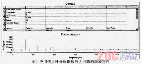 在頻域分析中就是以頻率作為分析的變量,分析信號(hào)中不同的頻率分量構(gòu)成。在頻率分析中,較為重要的概念就是電路的通頻帶與選擇性,作為諧振放大電路一方面要通過(guò)所需的頻率成分,因而對(duì)其具有通頻帶的要求,另一方面,要抑制不需要的信號(hào)的頻率成分,這種通過(guò)有效成分抑制無(wú)效成分的性質(zhì)稱為選擇性。但在實(shí)際應(yīng)用中往往要求通頻帶以內(nèi)傳輸系數(shù)盡可能大,通頻帶以外傳輸系數(shù)盡可能小,這樣信號(hào)失真小,抑制干擾能力強(qiáng),由此可見(jiàn)通頻帶與選擇性相矛盾,故用矩形系數(shù)K0.1說(shuō)明。理想諧振放大器的頻率特性曲線,其矩形系數(shù)K0.1應(yīng)等于1,實(shí)際的諧振放大器的矩形系數(shù)總是大于1的。應(yīng)用軟件的傅里葉分析的頻譜圖如圖4所示。