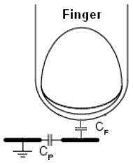 要感應(yīng)到手指的存在,電容式感應(yīng)系統(tǒng)首先要知道沒有手指時(shí)的傳感器電容(見圖2a),也稱為寄生電容(Cp)。當(dāng)手指接近或接觸傳感器時(shí)(見圖2b),傳感器電容值將會(huì)變化,這就產(chǎn)生了和Cp并聯(lián)的另一個(gè)電容,稱為手指電容(Cf)。有手指存在時(shí),總傳感器電容(Cx)如方程1所示: